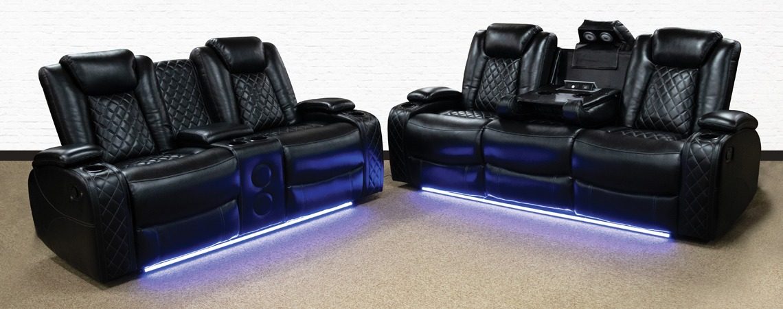 Omega Black features blue tooth speakers, cup holders, storage and charging. This innovative 3-piece sets takes all the technological features you need and wraps them up in a sleek, streamlined top-grain Polyurethane upholstery exterior. This group has extra wide seats taking movie night to a whole new level with this ultimate home theatre experience.